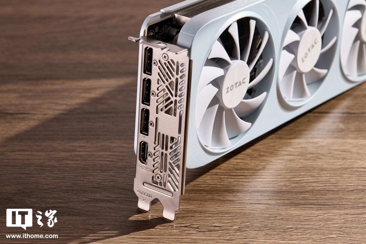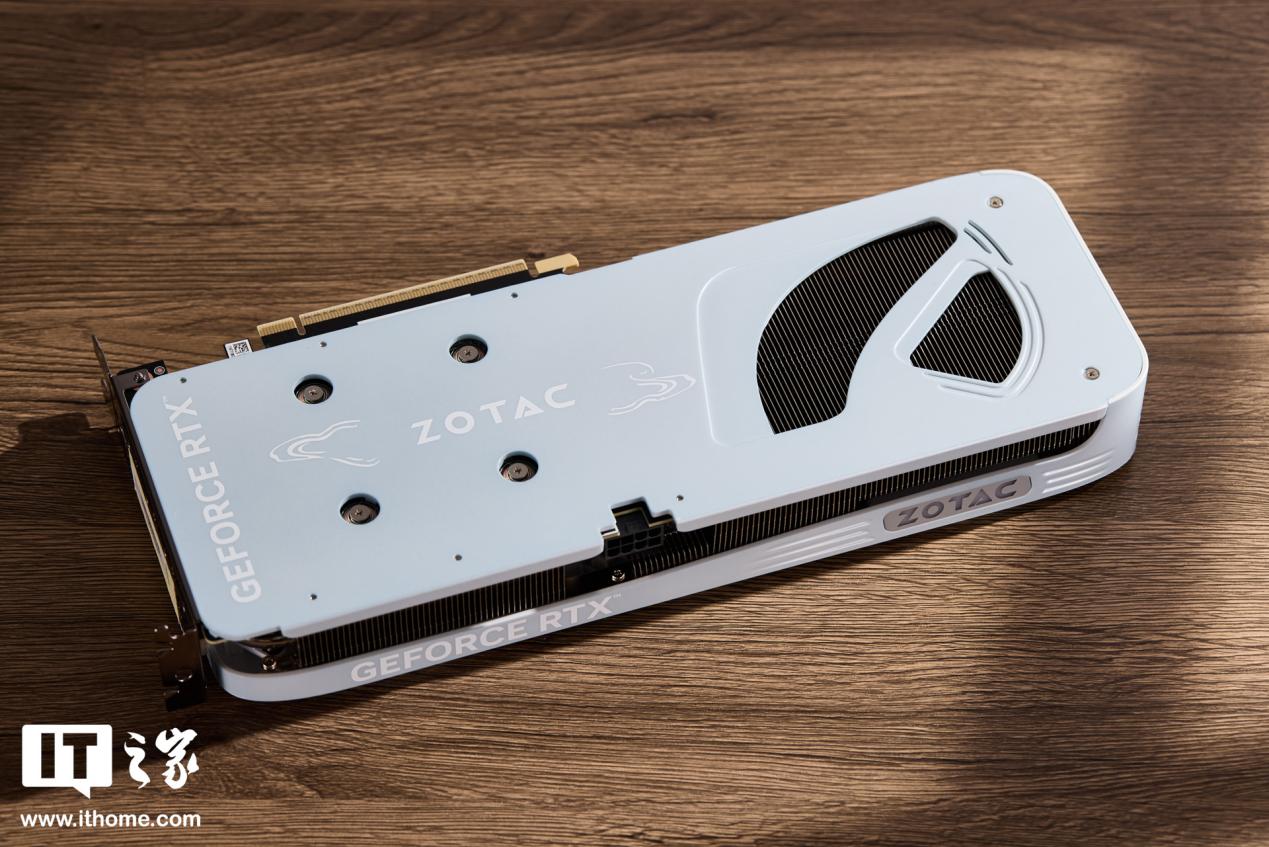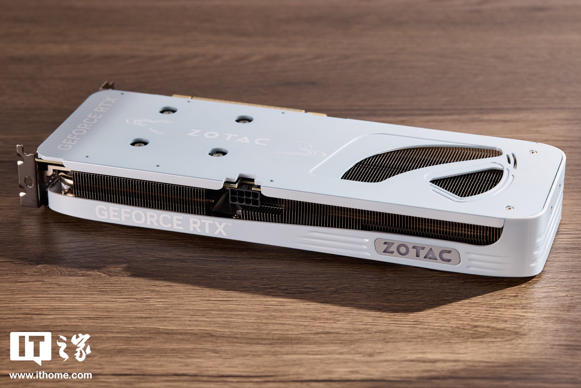 显卡背板做了穿透设计,更有利于热量排出,同时还有六枚螺丝扣,以及 GEFORCE RTX 以及 ZOTAC 的装饰图案。