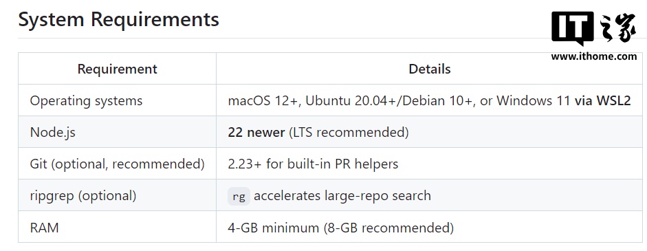 Codex CLI 可以在 macOS 12+、Ubuntu 20.04+/Debian 10+、Windows 11 的 WSL2 子系统中使用,要求最少拥有 4GB 内存(建议 8GB)。