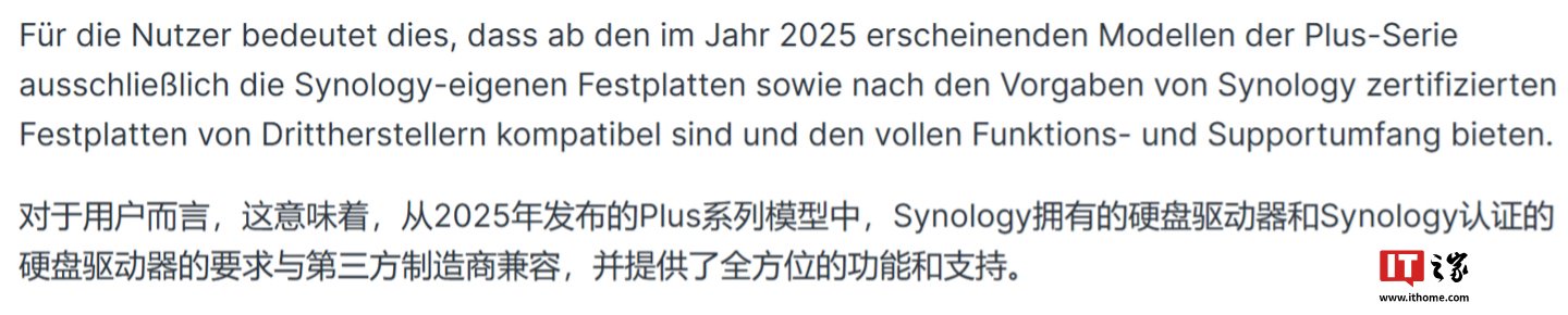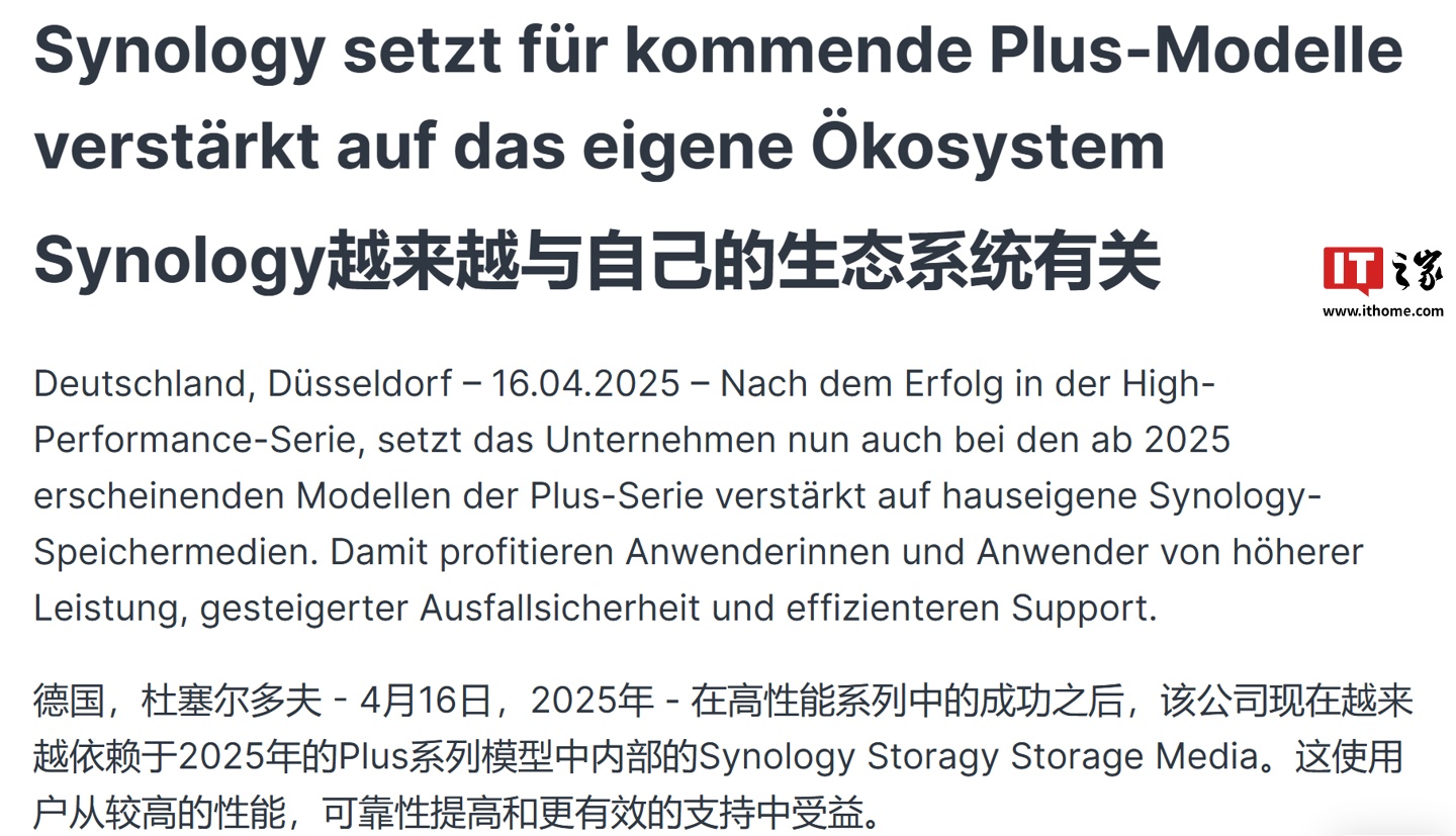 IT之家 4 月 17 日消息,群晖(Synology)德国官网发布博文,为了长期致力于打造围绕 NAS 系统的自有生态,宣布在 2025 年推出的 Plus 系列机型中,限制用户使用非官方或未经认证硬盘。