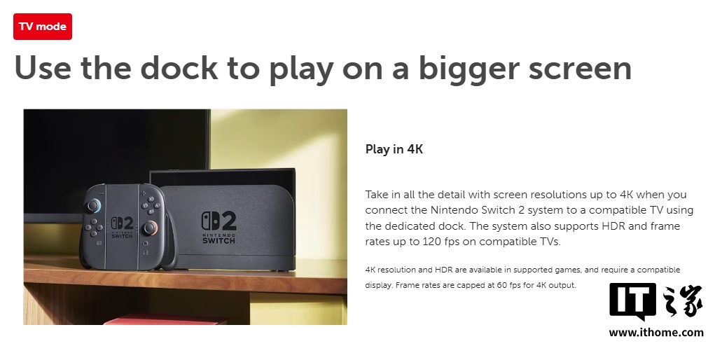 然而,现在情况出现了变化。在任天堂美国和加拿大的官方网站上,关于底座模式下支持 VRR 的描述已被删除。此前的描述为:“使用专用底座将任天堂 Switch 2 系统连接到兼容电视时,可享受高达 4K 的屏幕分辨率。该系统还支持 HDR、VRR 以及在兼容电视上最高可达 120fps 的帧率。”如今,该句子中已不再提及 VRR 功能。目前尚不清楚这是由于失误所致,还是任天堂对产品功能进行了调整,IT之家将持续关注后续消息。