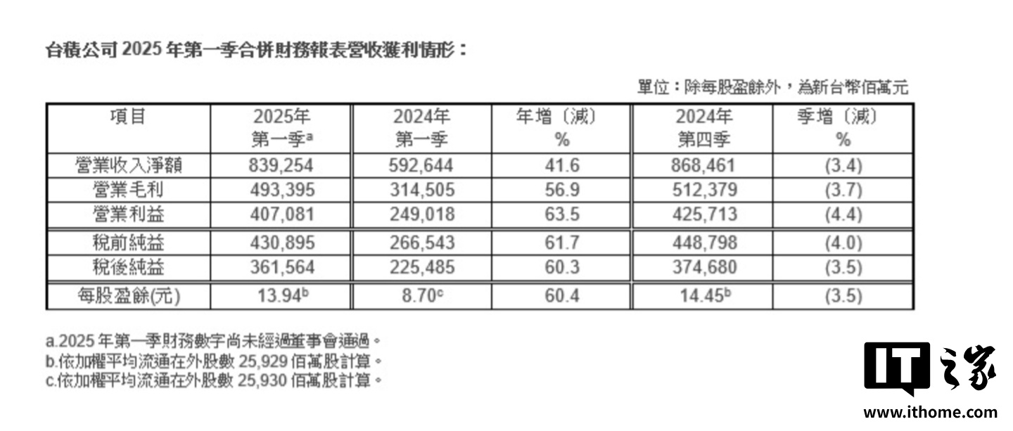 IT之家 4 月 17 日消息,台积电第一季度营收为 8,392.5 亿新台币(IT之家注:现汇率约合 1891.35 亿元人民币),同比增长 41.6%;净利润 3,616 亿元新台币(现汇率约合 814.91 亿元人民币),同比增长 60.3%,预估 3,467.6 亿元新台币。台积电第一季度毛利率 58.8%,预估 58.1%。
