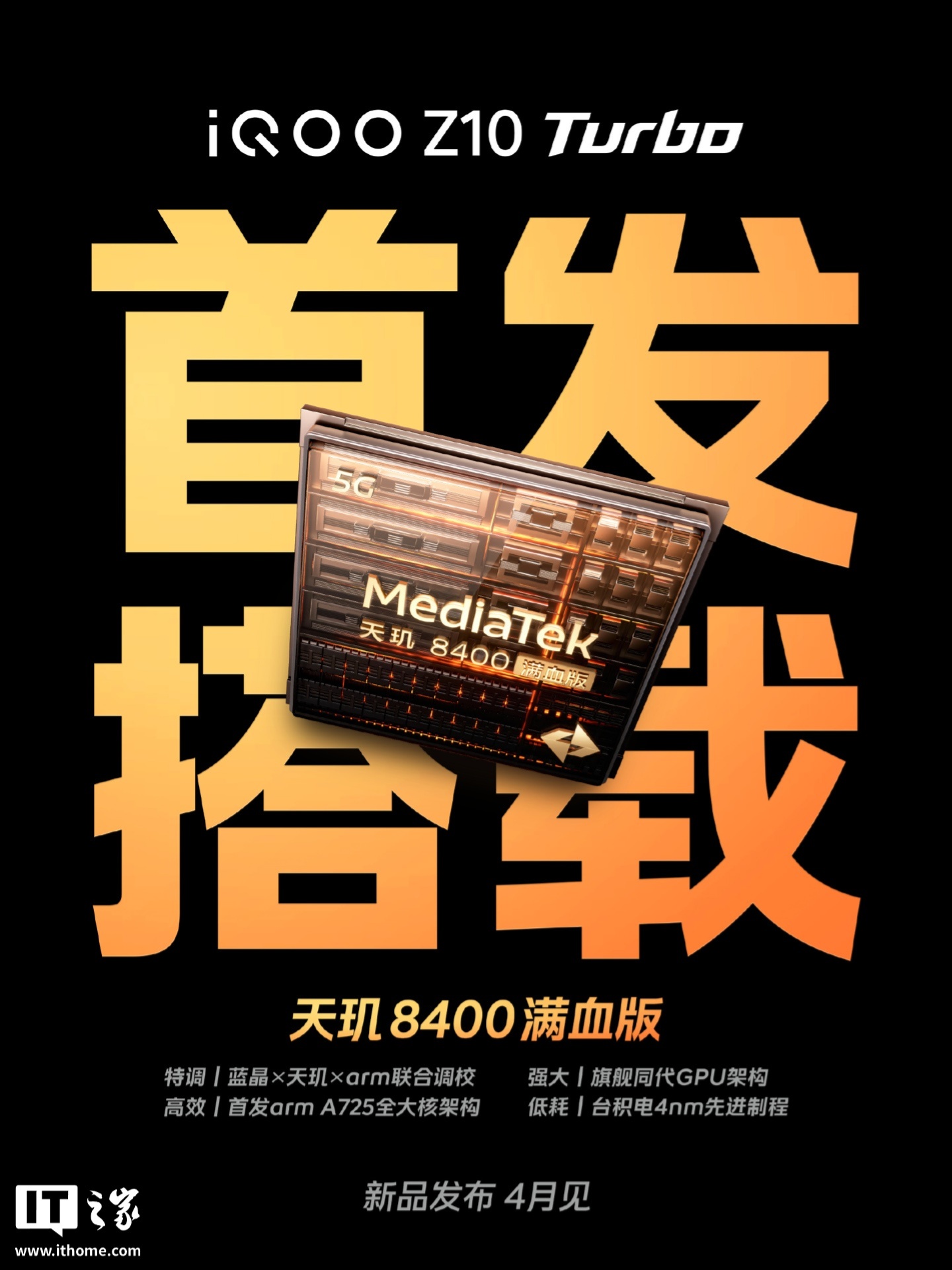 IT之家 4 月 17 日消息,iQOO Z10 Turbo 系列手机已官宣 4 月见。其中标准版全球首发天玑 8400 满血版处理器、Pro 首批搭载骁龙 8s Gen4 处理器。