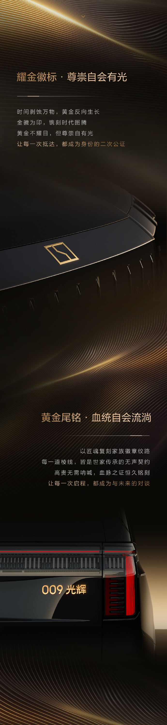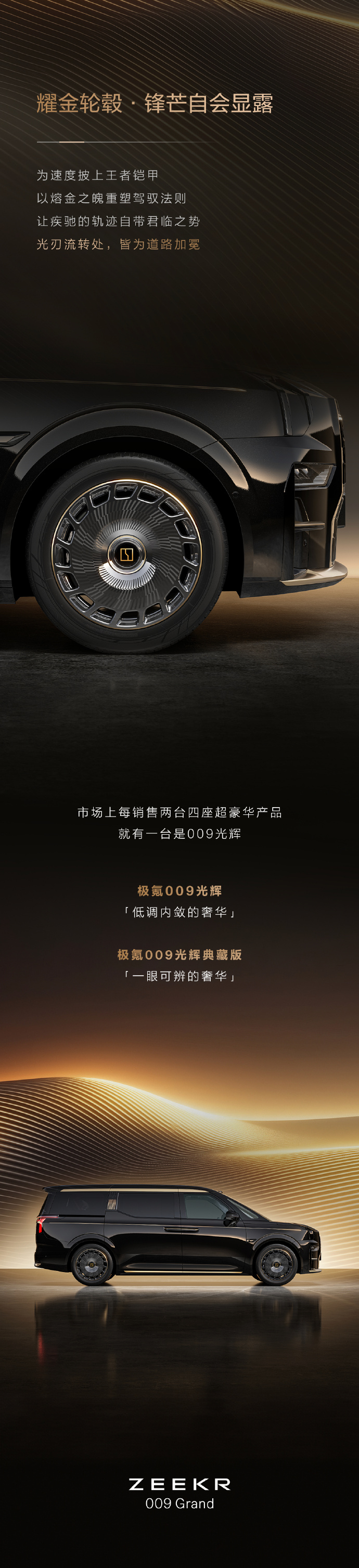 从官方海报看,这款新车前脸配备极氪“耀金徽标”,尾部配备 009 光辉“黄金尾铭”,车身侧面配备“耀金轮毂”。官方宣称,市场上每销售两台四座超豪华产品就有一台是 009 光辉。