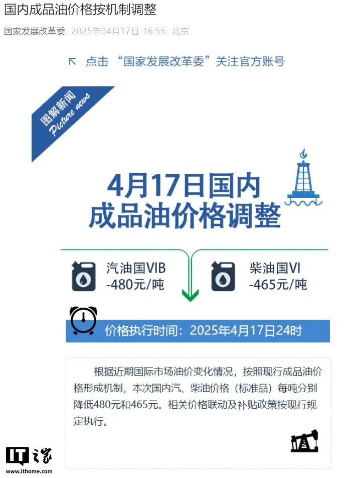 IT之家 4 月 17 日消息,国家发改委今日发布消息称,自今日 24 时起,国内汽油价格和柴油价格分别下调 480 元 / 吨和 465 元 / 吨。