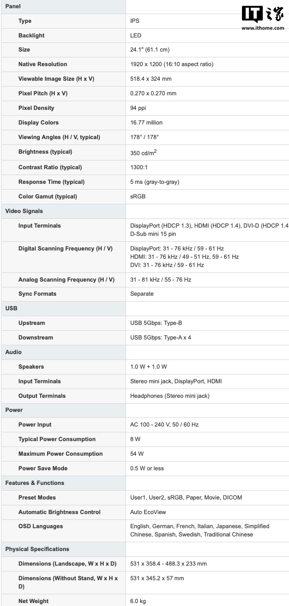 该显示器尺寸为 24.1 寸,面板为 IPS LED,分辨率为 1920*1200,比例为 16:10,内置防眩光涂层,支架支持高度、倾斜度及垂直旋转调节,并内置 Auto EcoView,可自动调节亮度;同时该显示器还内置 4 个 USB Type-A 接口,可轻松连接键鼠、打印机等外设。