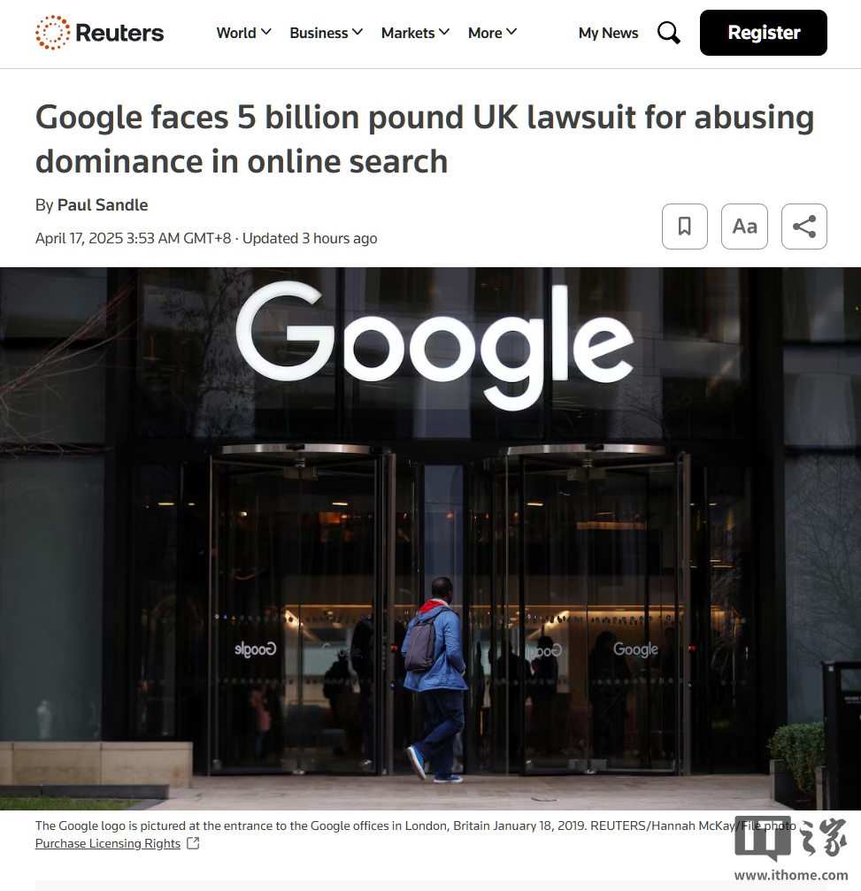 IT之家 4 月 17 日消息,据路透社报道,谷歌公司正在英国面临集体诉讼,索赔金额可能高达 50 亿英镑(IT之家注:现汇率约合 484.15 亿元人民币)。诉讼称,谷歌在在线搜索市场上滥用其主导地位,造成了不正当的市场定价。