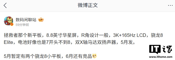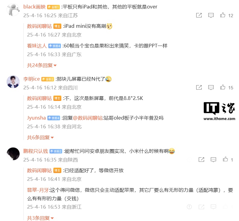博主还在评论区回复了部分网友的问题:针对平板只有 iPad 和其他的言论,博主回复“iPad mini 没有高刷