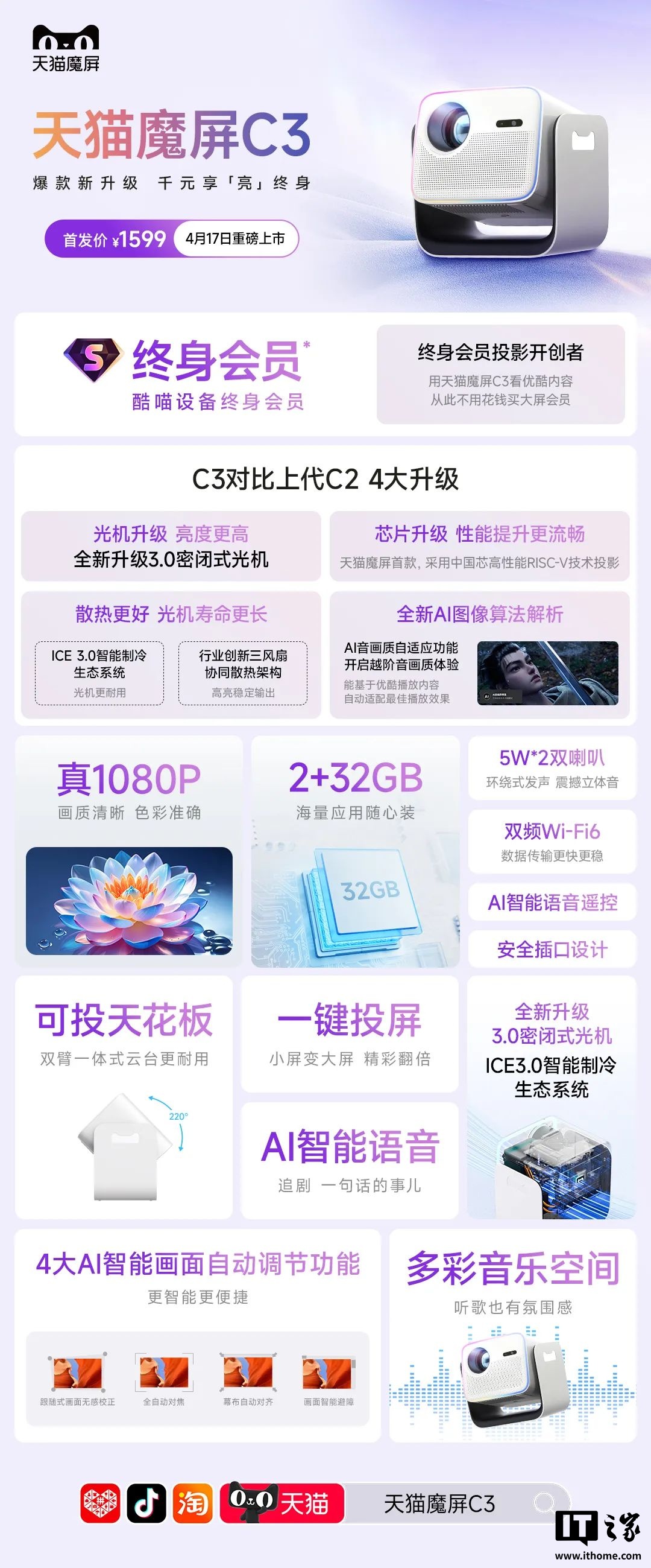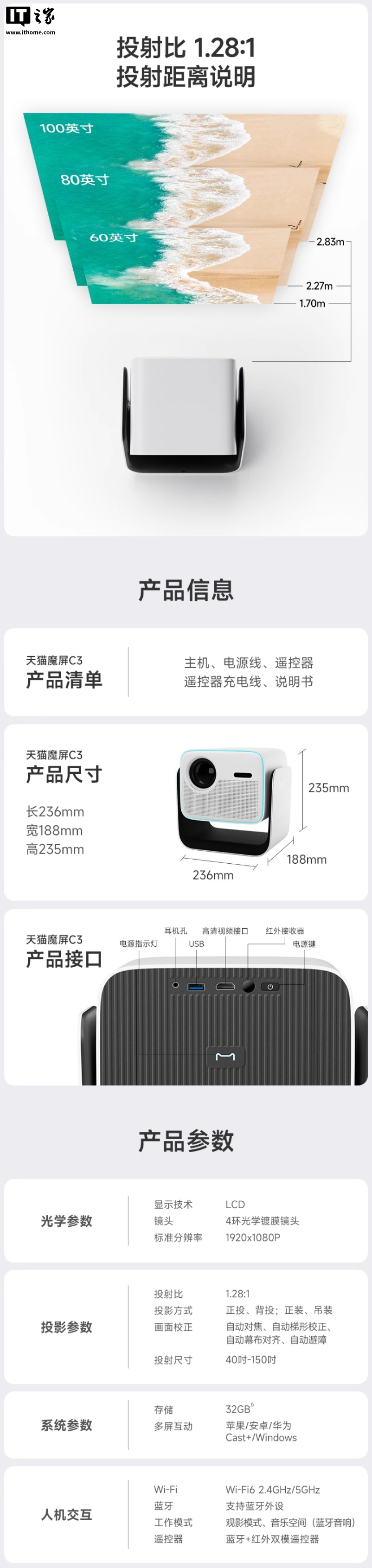 天猫魔屏 C3 投影仪今日上市,售价 1599 元,IT之家附参数表如下: