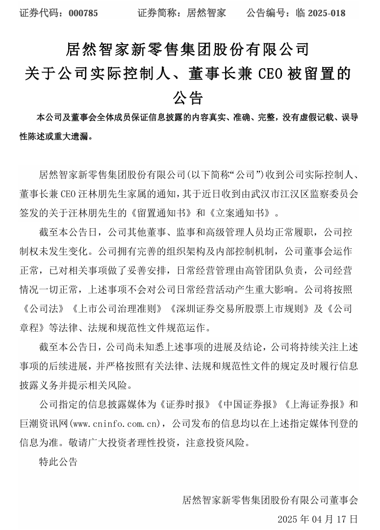 IT之家 4 月 17 日消息,居然智家(原名“居然之家”)今日发布公告,收到公司实际控制人、董事长兼 CEO 汪林朋先生家属的通知,其于近日收到由武汉市江汉区监察委员会签发的关于汪林朋先生的《留置通知书》和《立案通知书》。