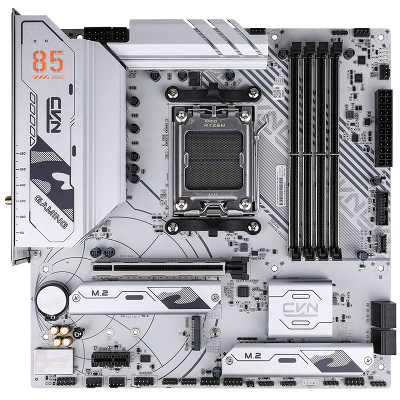 CVN B850M GAMING FROZEN V14 属于标准的 4DIMM 内存槽 245mm 宽度 M-ATX 板型。其采用 8 层白色 PCB 和银白寒霜合金散热装甲设计,搭载了 10+2+1 相供电模组 (60A DrMOS) 和 8+4 Pin 的 EPS CPU 供电接口。