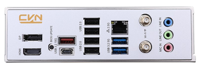 后置接口:1× HDMI TMDS、1× DP 1.2、1× USB-C 10Gbps、1× USB-A 10Gbps、4× USB-A 480Mbps、2× USB-A 5Gbps、1× 2.5GbE RJ45,一对 Wi-Fi 天线、3× 音频插孔。