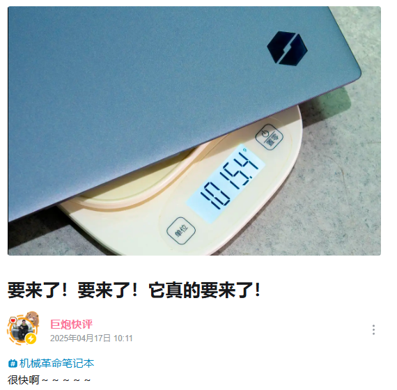 IT之家 4 月 18 日消息,up 主 @巨炮快评 昨日曝光了一款机械革命神秘新品,只透露它会“很快”发布。