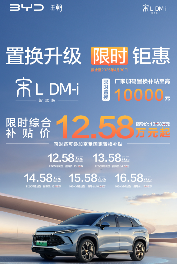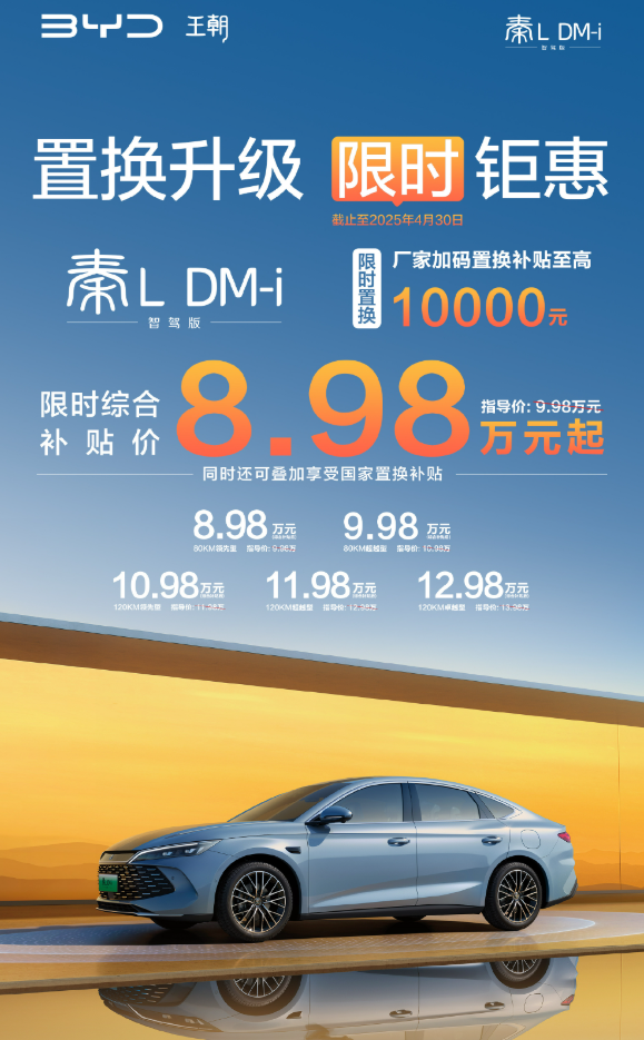 IT之家 4 月 18 日消息,比亚迪王朝网发布“置换升级限时钜惠”活动,即日起至 4 月 30 日 24:00 前购买秦 L DM-i 智驾版、宋 L DM-i 智驾版可享厂家置换补贴至高 1 万元,同时还可叠加享受国家置换补贴。