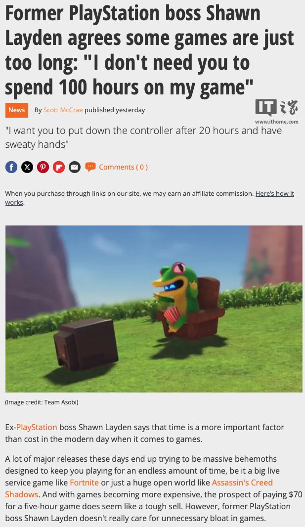 IT之家 4 月 18 日消息,SIE(索尼互动娱乐)前高管 Shawn Layden 近日接受 Player Driven 专访时表示,随着玩家年龄增长,冗长流程的现代游戏对他们的吸引力正在逐渐减弱。
