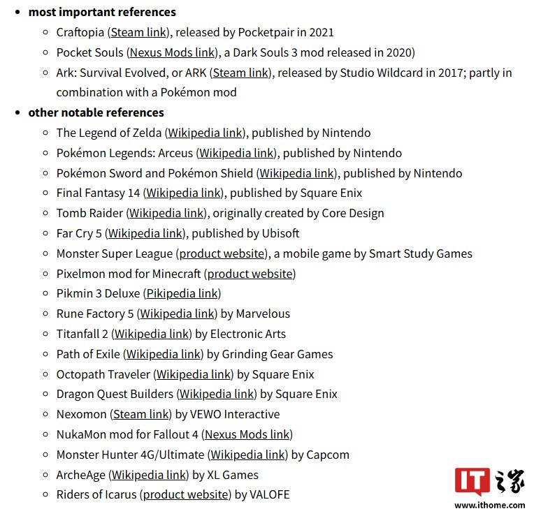 他们列举了包括自家游戏《Craftopia》、Studio Wildcard 的《ARK: Survival Evolved》、Marvelous 的《Rune Factory 5》,甚至任天堂自家的《塞尔达传说》和《宝可梦》系列。此外,玩家自制的《Minecraft》模组《Pixelmon》和《Fallout 4》模组《Nukamon》也被纳入辩护清单。