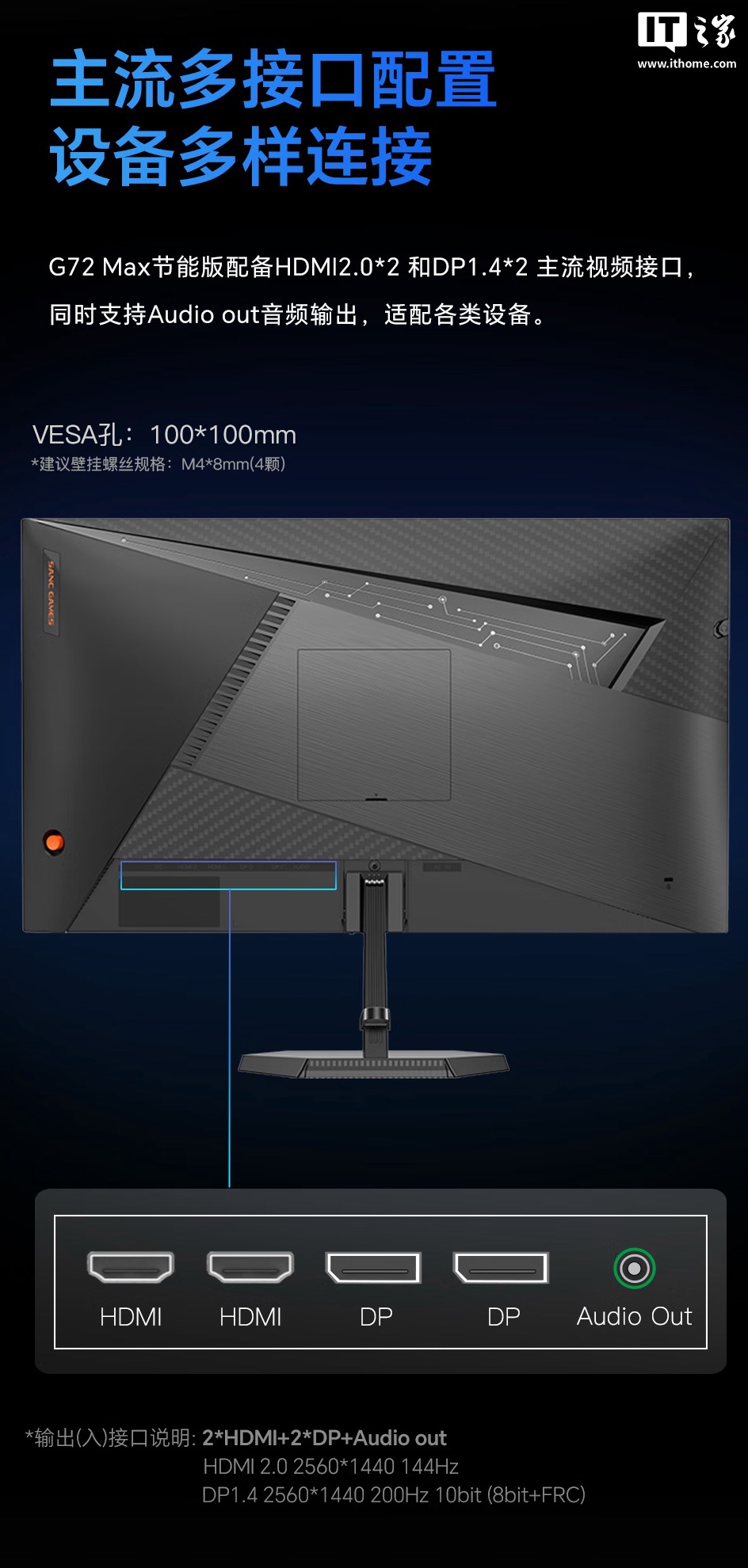 这款显示器支架不支持调节,不过显示器本体支持 VESA 100x100mm 壁挂,同时带有小夜灯和耳机挂架。其他方面,该显示器配备 2 个 HDMI 2.0 接口(2K 144Hz)、2 个 DP 1.4 接口(2K 200Hz)。