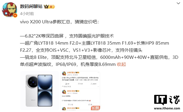 IT之家 4 月 19 日消息,vivo X200 Ultra 手机将于 4 月 21 日 19:00 发布,博主 @数码闲聊站 今日对这款旗舰新机的参数进行了汇总。
