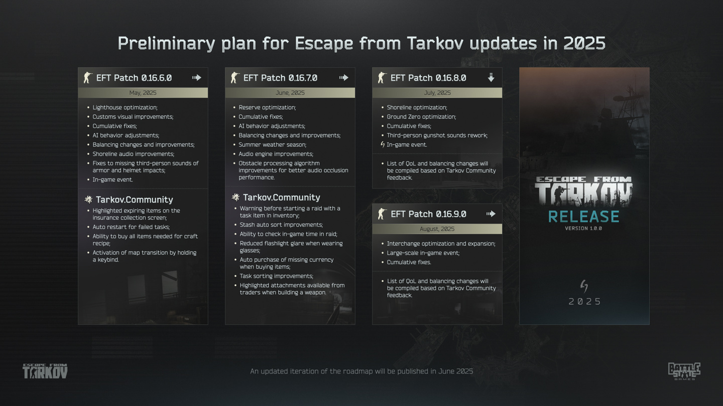 IT之家注意到,《逃离塔科夫》游戏官方今日更新了最新的路线图,游戏计划在五次大更新后推出正式版。