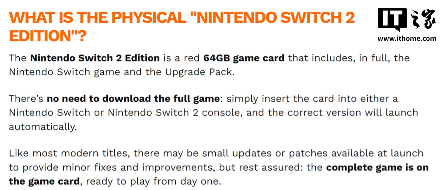IT之家提醒,在主机可能缺货的情况下,考虑预购任天堂 Switch 2 的玩家可先行购买 Switch 2 版本的游戏卡带并在现有 Switch 上进行游玩,待未来购得新主机后再体验强化画面等升级内容。