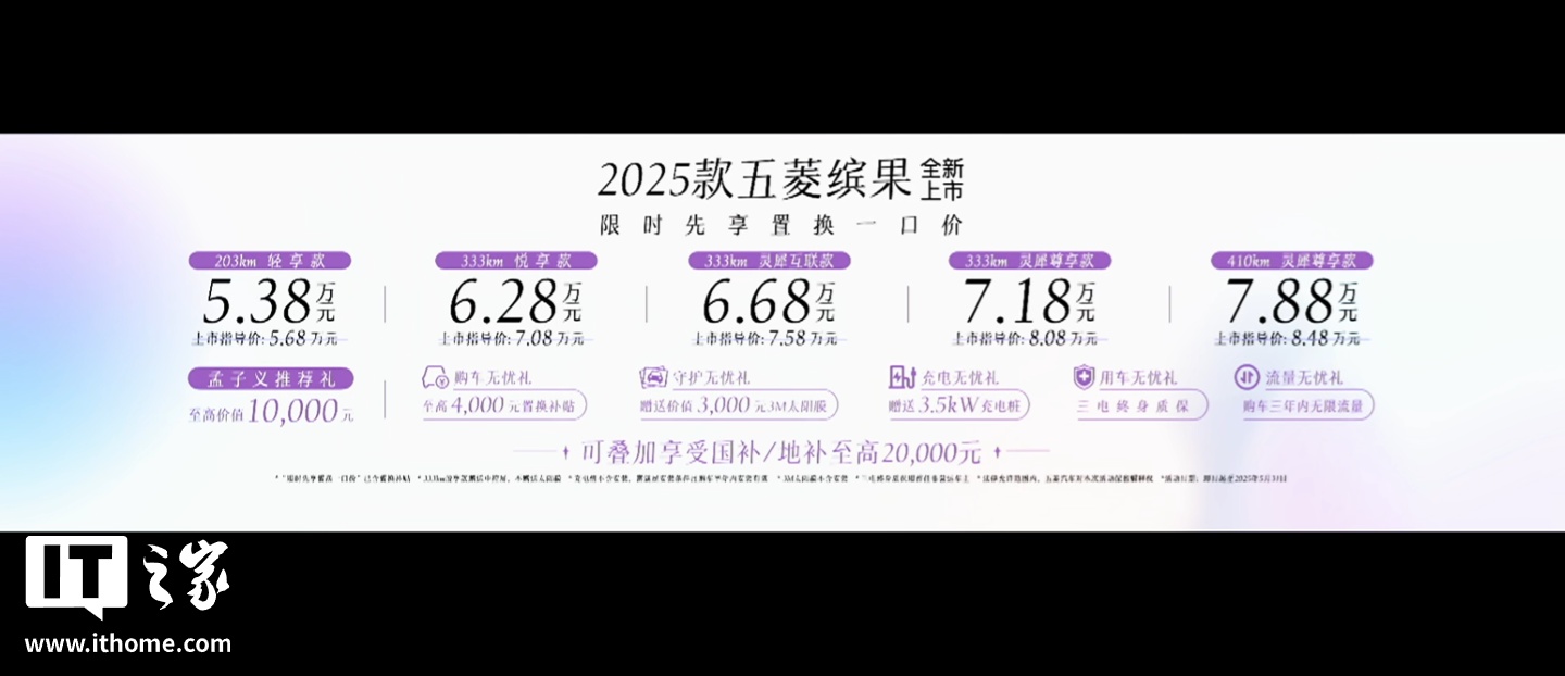 IT之家 4 月 19 日消息,2025 款五菱缤果纯电小车今日上市,新增芋泥紫等配色,全新升级浮岛式双层中央扶手,官方指导价 5.68 万元起,限时先享换一口价 5.38 万元起,还可叠加国补 / 地补。
