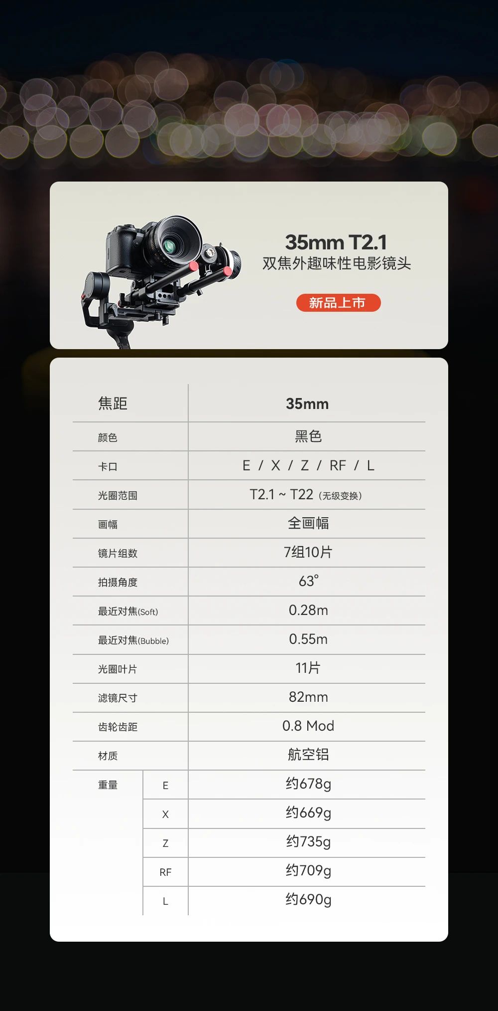 作为趣味性电影镜头,其核心亮点在于支持 Bubble(泡泡焦)与 Soft(柔焦)双模式切换,配合 T2.1-T22 无级光圈调节系统,可实现焦外效果的实时调控。