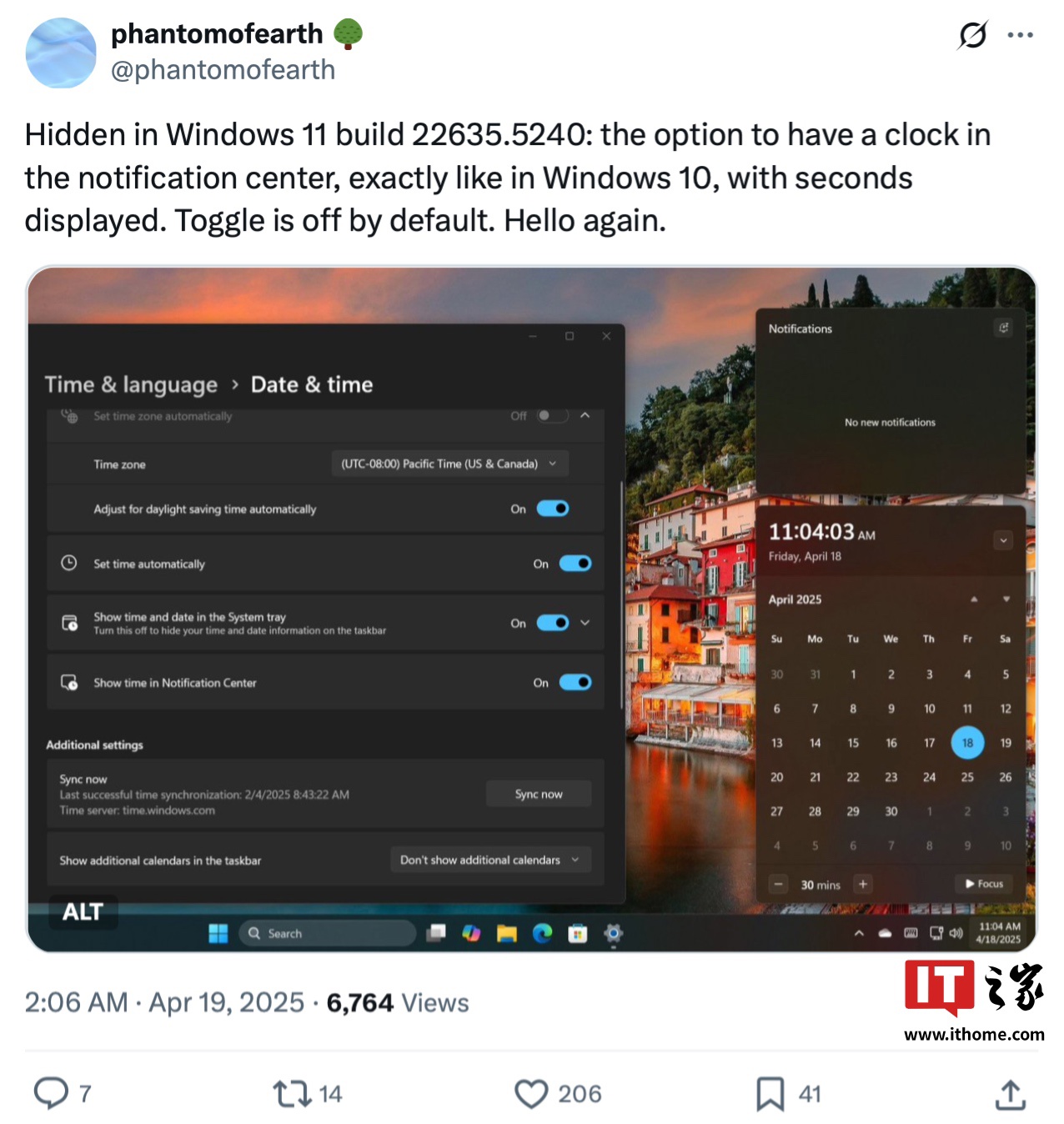 在 Windows 11 最新的 Build 22635.5240 中,系统设置中已具有一项“在通知中心中添加时钟”按钮,点击按钮后即可在任务栏日历弹窗看到相应时间信息,其整体排版和 Windows 10 时期大致相同,只是字体有所调整。