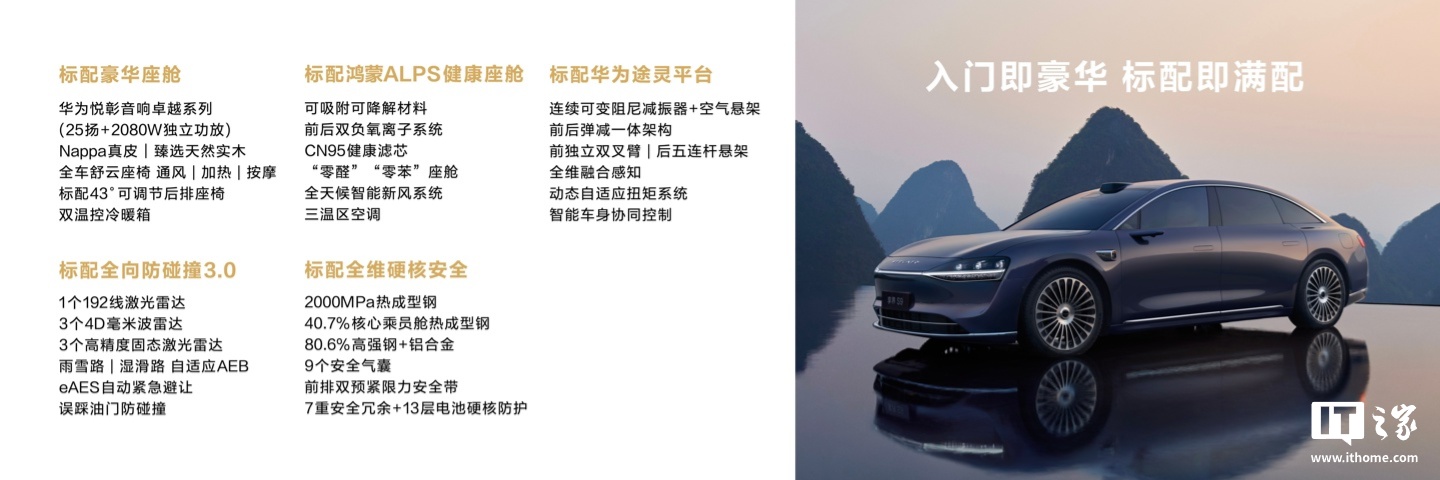 新车提供浩宇蓝、寰宇红、鎏金黑、深空灰等配色,搭载 HUAWEI XPIXEL 百万像素车语大灯,首发寰宇主题迎宾灯效和交互式迎宾光毯,支持节奏光剑体感游戏,同时还支持 100 英寸户外巨幕投影。