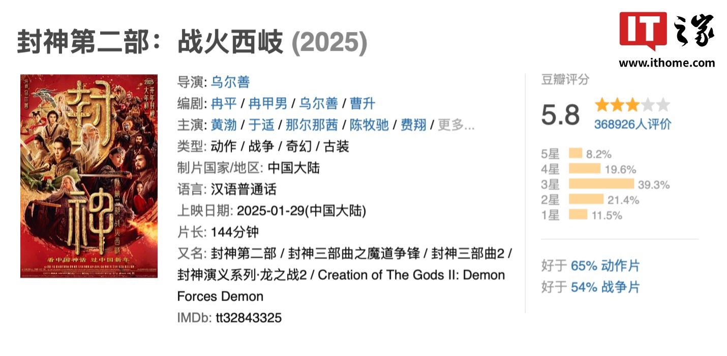 IT之家查询获悉,目前电影《封神第二部:战火西岐》豆瓣评分 5.8,其中 8.2% 的用户给出 5 星评价、19.6% 给出 4 星、39.3% 给出 3 星、21.4% 给出 2 星、11.5% 给出 1 星。