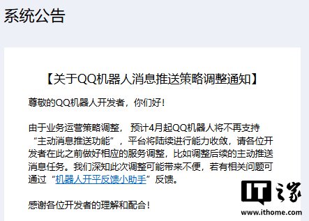 IT之家 4 月 20 日消息,腾讯 QQ 本周三发布公告,宣布 QQ 机器人将不再支持“主动消息推送功能”,平台将陆续进行能力收敛。IT之家附原文如下: