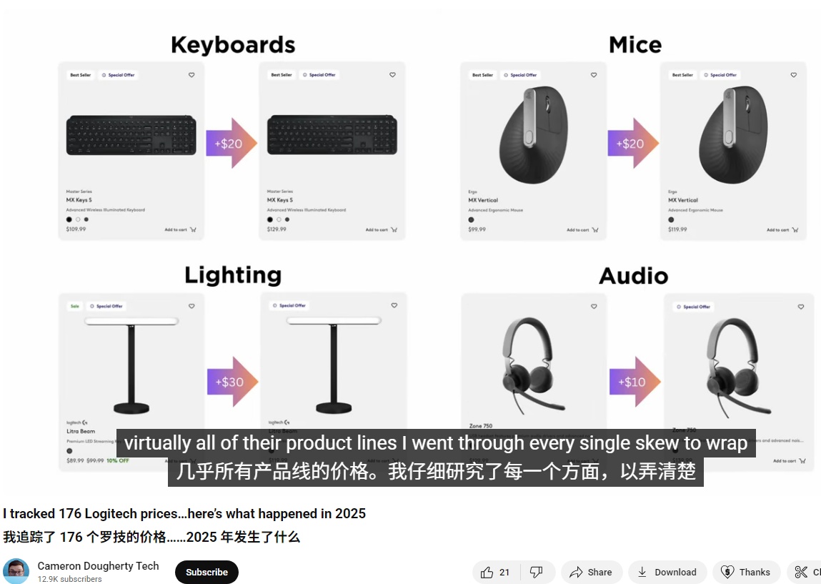 Dougherty 提到一些没有涨价的产品,包括 MX Ergo 鼠标和 G703 游戏鼠标。根据视频,一些产品的价格实际上有所下降,例如 Pro X Superlight 鼠标,原价为 159.99 美元,现在为 149.99 美元。