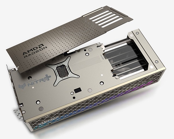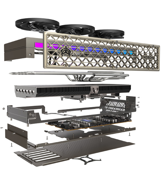 该显卡采用 12 层 PCB,配备高强度冷轧钢框架,散热解决方案为霍尼韦尔 PTM7950 导热介质 + 三分区铜底 + 六热管 + 三风扇,其中风扇采用环叶结构、支持快拆。