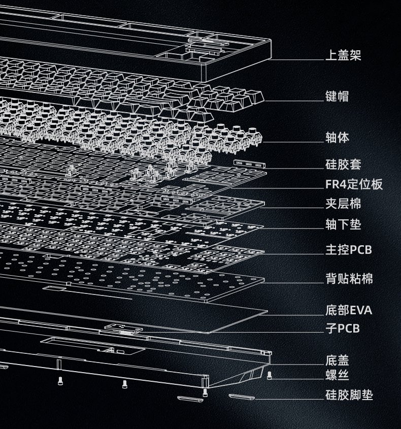 该键盘采用黑色阳极氧化 CNC 全铝外壳,内部为 Gasket 垫片固定结构,具备 FR4 定位板和多层填充结构。此外其搭载原厂高度 PBT 材质键帽和下灯位 RGB 背光,支持 8KHz 回报率和 0.125ms 低延迟。