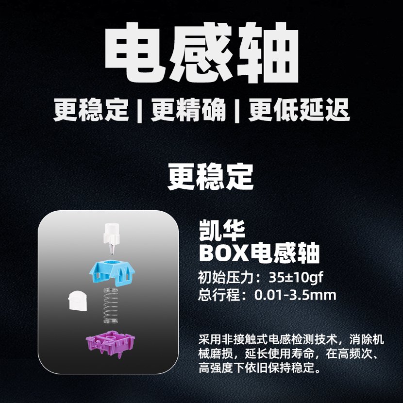 Epomaker Magcore 87 搭载基于非接触式电感检测技术的凯华 BOX 电感轴,轴体初始压力 35±10gf,总行程 0.01~3.5mm,支持 0.01ms 精度 340 级触发行程调整,具备快速重置、快速触发、DKS 等一系列功能。