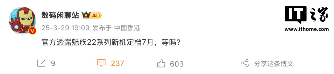 上个月博主 @数码闲聊站 透露,“官方透露魅族 22 系列新机定档 7 月”。