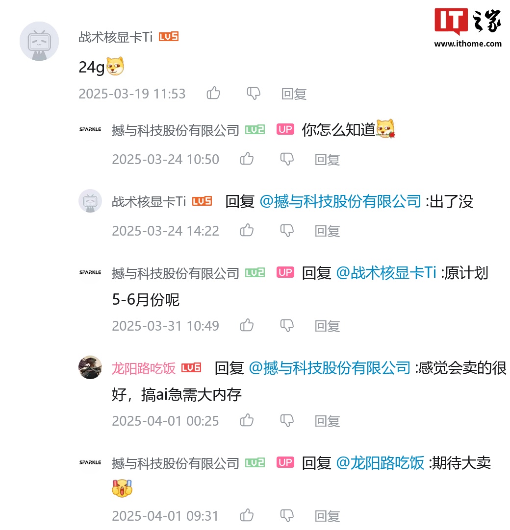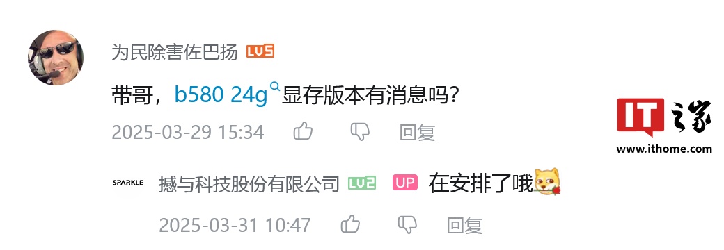 IT之家 4 月 21 日消息,英特尔锐炫独立显卡 OEM 厂商 Sparkle 撼与的官方B站账户 撼与科技股份有限公司 在其一条发布于 3 月 4 日的动态下方评论区表示,锐炫 B580 24GB 显卡“在安排了哦”“原计划 5-6 月份呢”。