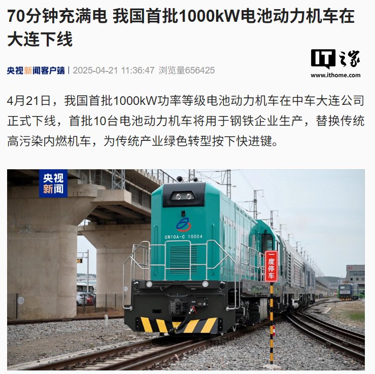 IT之家 4 月 21 日消息,据央视新闻报道,我国首批 1000kW 功率等级电池动力机车今日在中车大连公司正式下线,首批 10 台电池动力机车将用于钢铁企业生产,替换传统高污染内燃机车,为传统产业绿色转型按下快进键。