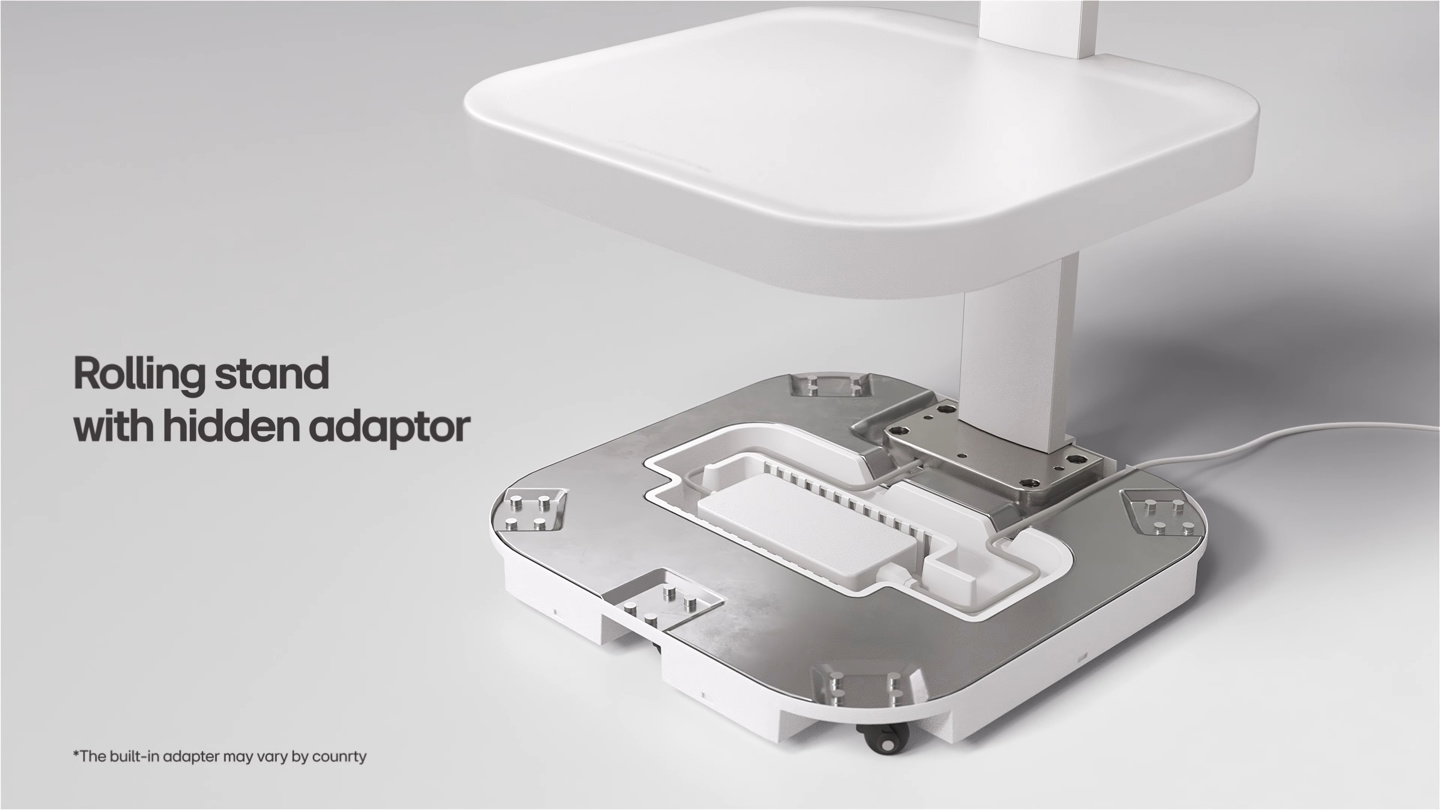 Smart Monitor Swing 的支架上部为一条多关节全铰接臂,具有广阔的调节空间,支持垂直纵向、左右旋转、上下俯仰调整,让屏幕更符合人体工学,还可切换到竖屏模式。而 32U889SA 支架底部则内置电源适配器,并拥有多个用于移动的滚轮。