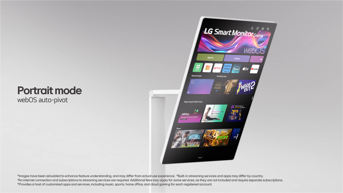 得益于内置的 webOS24 操作系统,Smart Monitor Swing 无需连接到外部主机设备就能欣赏到 LG 提供的流媒体内容,也可作为云游戏终端使用。