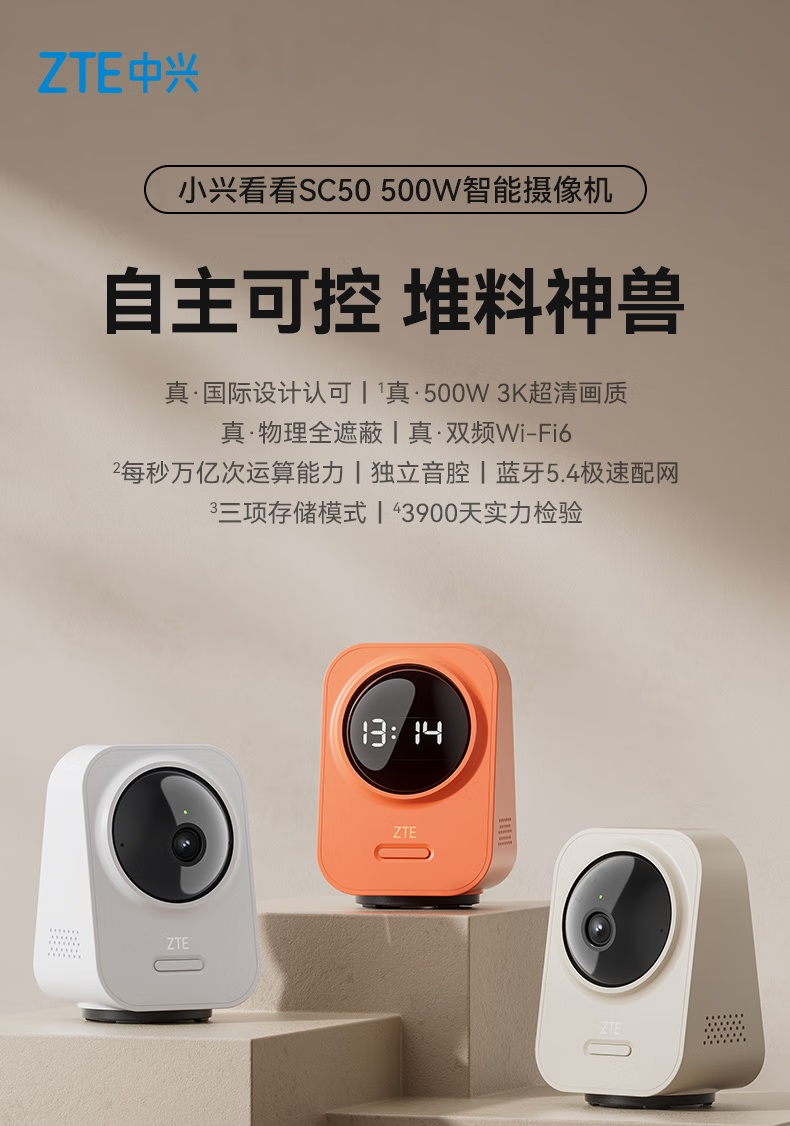 IT之家 4 月 21 日消息,中兴智慧家庭今天推出一款全新的智能家用摄像机 —— 小兴看看 SC50,京东首发价 189 元起(还可以选择 32/64GB 内存卡套装),叠加国补后 160.65 元起。