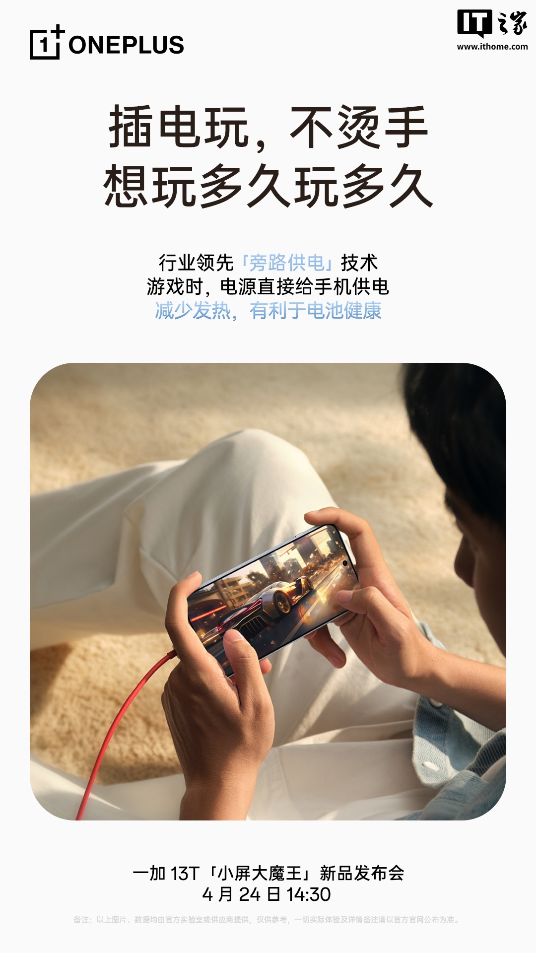 据一加手机最新预热,一加 13T 将搭载「旁路供电」技术,号称“插电玩,不烫手,想玩多久玩多久”。