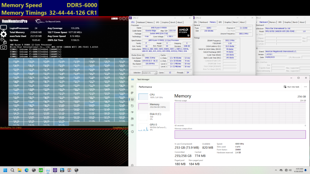 此套装已在 AMD X870 平台上完成验证,并导入 AMD EXPO 超频技术,以下为搭配 AMD R7 9800X3D 与华硕 ROG CROSSHAIR X870E HERO 主板,以及搭配 R9 9900X 与微星 MPG X870E CARBON WIFI 主板完成验证的烤机图:
