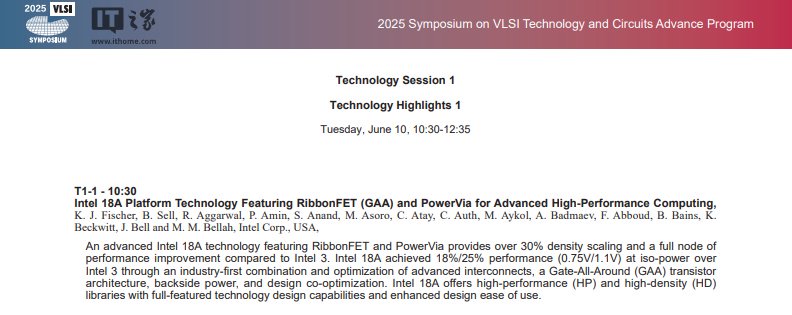 VLSI 官方今日发布预览文档,简要介绍了一系列将于 VLSI 研讨会上公布的论文,例如 Intel 18A 工艺技术细节。