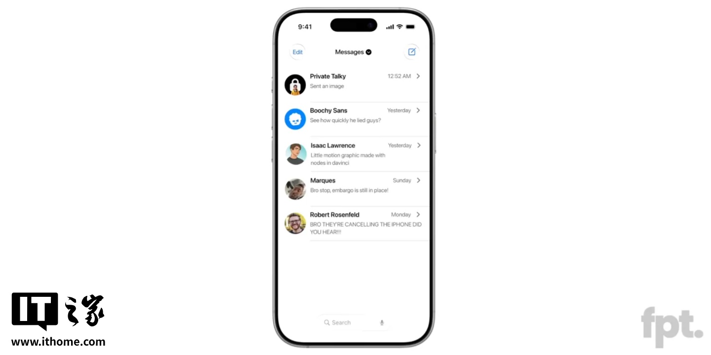 然而,根据科技博主 Jon Prosser 的爆料,iOS 19 将对应用内搜索栏的位置进行调整。据称,iOS 19 将把应用内的搜索栏移至屏幕底部,这一改变将使用户能够更自然地使用拇指进行操作。Prosser 在其最新视频中展示了这一改动的模拟效果,以信息(Messages)应用为例,目前该应用的搜索栏位于顶部,需要下拉才能显示;而在 iOS 19 中,搜索栏将始终可见,并且位于屏幕底部,方便用户随时使用。