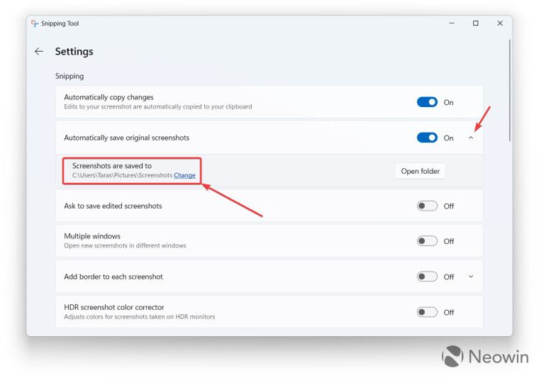 操作十分简单:打开 Snipping Tool,点击右上角三点按钮,找到“自动保存原始截图”选项,点击“更改”链接,选择新的存储路径即可。