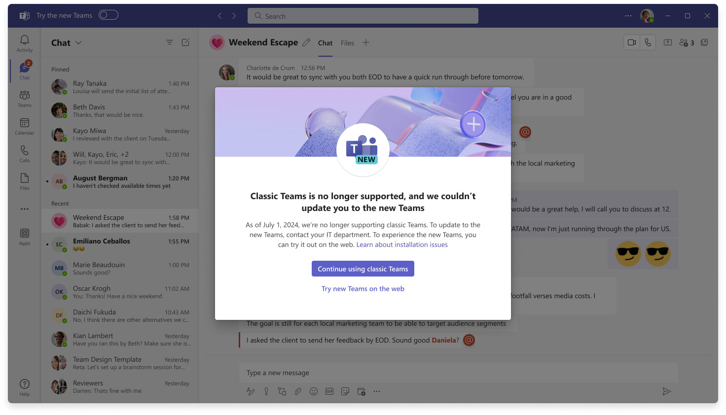 微软已经于 2024 年 10 月终止支持经典版 Teams,并宣布 2025 年 7 月 1 日正式停用该应用。微软为了加速过渡,宣布移除经典版 Teams 的关键功能,日志中将该调整定义为“重大变更”。