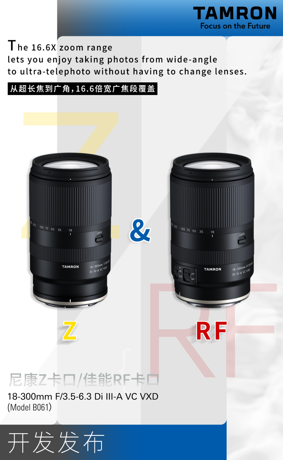 IT之家 4 月 22 日消息,腾龙公司今日宣布将开发适用于 APS-C 画幅无反相机的大变焦镜头 18-300mm F/3.5-6.3 Di III-A VC VXD(型号 B061)(以下简称 B061)的尼康 Z 卡口和佳能 RF 卡口版本。