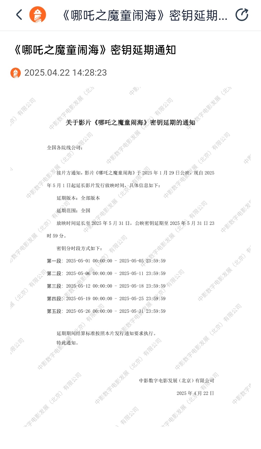 IT之家 4 月 22 日消息,灯塔专业版显示,电影《哪吒之魔童闹海》片方发布密钥延期通知,从 4 月 30 日延长上映至 5 月 31 日,而这已经是本片第三次延期。