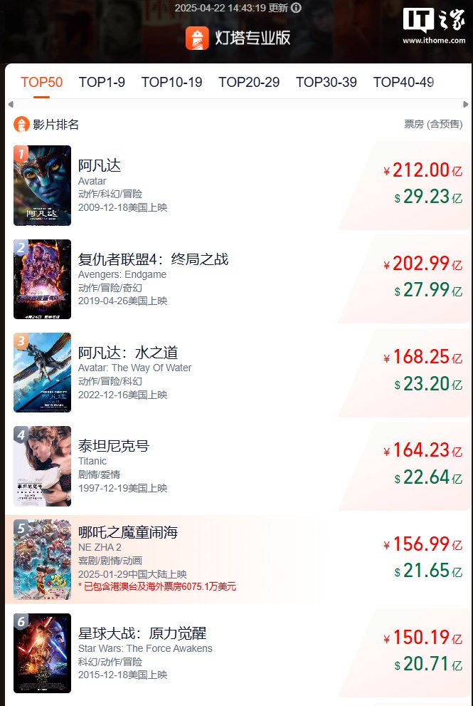 截至IT之家发稿,电影《哪吒之魔童闹海》全球累计票房达 156.99 亿元(包含港澳台及海外票房 6075.1 万美元),位居影史第五。