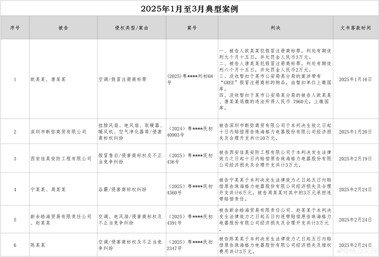 格力电器表示,2024 年 1 月至 2025 年 3 月,刑事案件结案 4 起,有 5 人被判处有期徒刑 6 个月至 3 年不等、罚金总计 20 万元;民事案件结案 356 起,判赔金额总计 1607.62 万元;行政案件结案结案 4 起,处以罚款总计 71814 元。