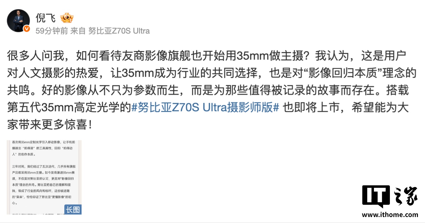 IT之家 4 月 22 日消息,今日上午,中兴通讯终端事业部总裁、努比亚技术有限公司总裁倪飞发文,为即将发布的努比亚 Z70S Ultra 摄影师版手机预热。